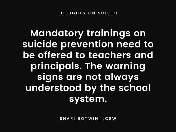 “Schools do not give suicide enough attention, especially during middle school,” says Shari Botwin, LCSW. “Mandatory trainings on suicide prevention need to be offered to teachers and principals.”
