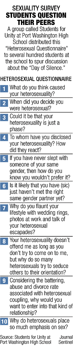 9th Circuit Panel Edits Parental-Rights Decision Judges soften harsh statement against the right of parents to control their children's education. A three-judge panel of the 9th U.S. Circuit Court of Appeals has taken the unusual step of editing one of its rulings in a parental-rights case. According to Mat Staver, president of Liberty Counsel, the panel, led by ultraliberal jurist Steven Reinhardt, decided to review its ruling in Fields v. Palmdale School District -- a 2005 decision in which the judges told parents in Palmdale, Calif., they had no constitutional right to object to any sex-ed curriculum offered in public schools. read more U.N. Making Home-schooling Illegal? WorldNetDaily, 5.27.2006 High School Gay Group’s Sexual-Orientation Questionnaire Stirs Parent Backlash By Terry Vanderheyden PORT WASHINGTON, Wisconsin, May 17, 2006 (LifeSiteNews.com) – A high school student club for homosexuals has raised the ire of parents through a “Heterosexual Questionnaire” that posed such questions as, “If you have never slept with someone of your same gender, then how do you know you wouldn’t prefer it?” Hundreds of students were asked to write answers to the highly personal questions in what the group claims was part of a national homosexual awareness campaign dubbed the Day of Silence. Two teachers approved distribution of the survey, according to a Milwaukee Journal-Sentinel report. (c) Copyright: LifeSiteNews.com, a production of Interim Publishing. Permission to republish granted but acknowledgement of source (use LifeSiteNews.com) is *REQUIRED* Read other questions on the survey>>Kentucky: ACLU Sues to Halt Graduation Prayer AP on Lexington Herald-Leader, 5.17.2006 California Senate Votes to Force All California Public Schools to Promote Homosexuality, Trans-sexuality, Bisexuality Education Christian Wire Service, 5.11.2006 Capitol Resource Institute California Family Council SB 1437 Golden-State Senators Pass Bill to Teach Kids About Homosexuality Citizen Link, Wendy Cloyd, 5.12.2006 Curriculum would have to include gay historical figures and speak only positively about homosexuality. California Senate Okays Lessons on 'Gays' in Textbooks Retuers on Boston Globe, 5.11.2006 Florida: "School District Bans Gay Sites, Ex-Gays OK" 365Gay.com, 5.9.2006 Palm Beach County's school board is under fire for blocking access to the Web sites of LGBT rights groups while allowing sites advocating the so-called ex-gay movement to go unfiltered. The school district defends the blocking. It say that it is only following federal government guidelines. Its computer security manager, Bob LaRocca, says the filtering software being used comply with the Child Online Protection Act and the Children Internet Protection Act. At the request of the Palm Beach Human Rights Council the American Civil Liberties Union is reviewing the school district's policy. "If their blocking software prevents kids, particularly middle and high school kids, from having access to information about gay rights and public health issues, but on the other hand allow access to religious group Web sites that are hostile to gay and lesbian legal rights and public health, that constitutes censorship," James Green, an ACLU lawyer told the Palm Beach Post. A Page From Glendening's Book: Books for Private Schools with Public Funds Washington Post, Nancy Trejos and Tim Craig, 5.11.2006